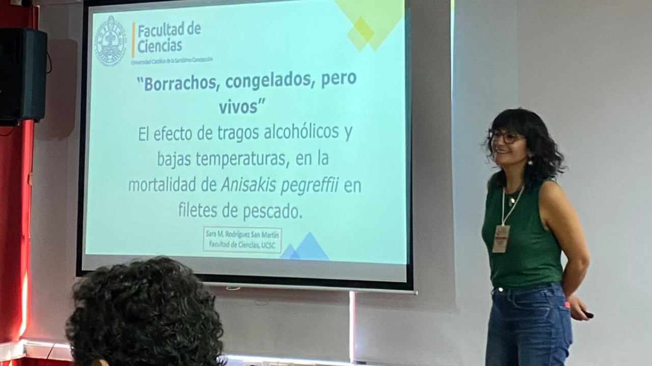 En la oportunidad, la académica expuso resultados finales de experimento in vitro sobre la influencia del consumo de alcohol en la mortalidad y movimiento de los parásitos anisakis presentes en los filetes de pescado crudo. El estudio se encuentra bajo revisión en revista científica.