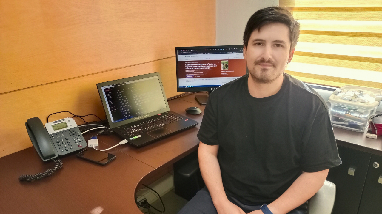 Recientemente, el Dr. Enrique Muñoz publicó un estudio internacional, en el marco de sus estudios de postgrado. Evaluó la distribución del radioisótopo Berilio-7 en sedimento fino de un río del Reino Unido. “Para utilizarlo como trazador de partículas y contaminantes en los ríos, necesitamos entender cómo se mueve este radioisótopo. Realizamos un análisis de este trazador, cómo interactúa con las partículas y su distribución”, explicó.